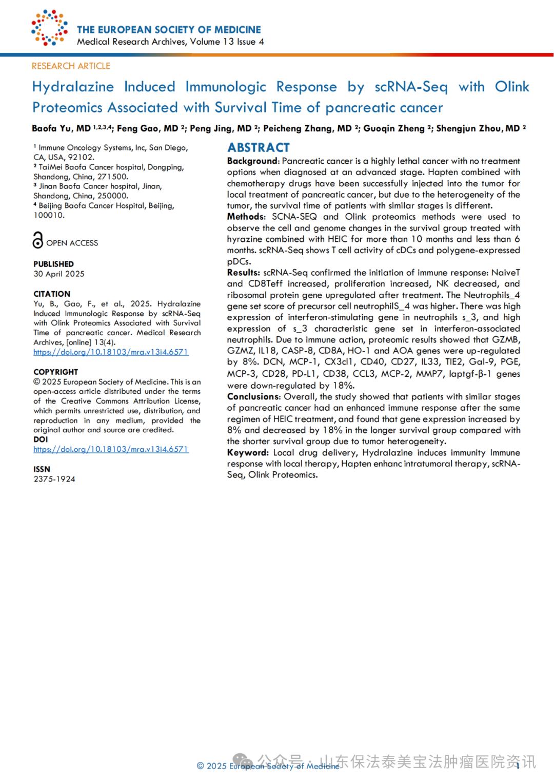 泰美宝法肿瘤医院院长、俄罗斯自然科学院外籍院士、知名肿瘤专家——于保法教授及其团队在欧洲医学杂志发表了文章《Hydralazine Induced Immunologic Response by scRNA-Seq with Olink Proteomics Associated with Survival Time of pancreatic cancer》通过单细胞RNA测序和Olink蛋白质组学研究的肼屈嗪诱导的免疫应答与胰腺癌患者的生存时间相关。