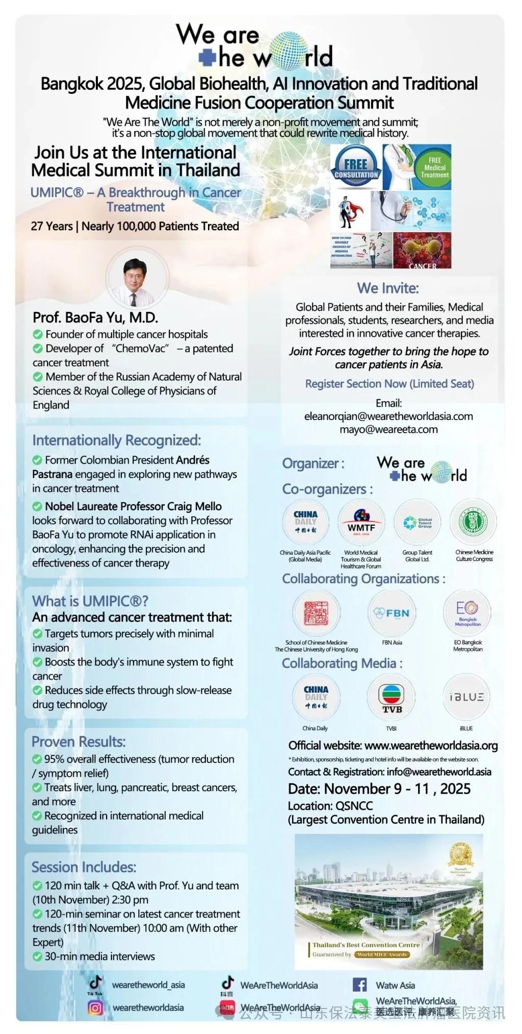 2025年11月9日—11日,“2025 曼谷世界生物健康、人工智能与传统医学合作峰会”将在泰国诗丽吉王后国家会议中心召开。此次峰会汇聚了全球医学领域的顶尖专家,是一场探讨生物健康、人工智能与传统医学融合发展,为慢性病、癌症等重大疾病患者提供突破性解决方案的学术盛会。